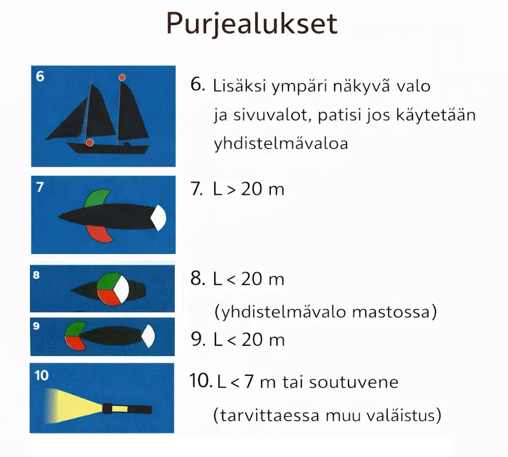 Kansainvälisten meriteiden yhteentörmäysten ehkäisemissääntöjen (COLREG) mukaan purje- ja moottorittomien alusten on näytettävä seuraavat kulkuvalot liikkuessaan pimeässä.
