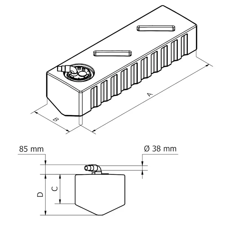 Sertifioitu korkeatiheyksisestä polymeerimuovista valmistettu säiliö, joka soveltuu happojen ja polttoaineen säilytykseen. Säiliöön on asennettu vakio-tarkastusluukku, jossa on polttoaineen täyttöjärjestelmän standardiaukko (kansi mukana), 3/8″ adapteri ilmanvaihtoletkulle sekä polttoaineen ulostulo.