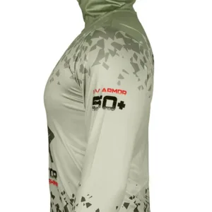 Myös pään suojaus on huomioitu, sillä pää voi kuumentua nopeasti. Siksi paidassa on korkea kaulus hupulla sekä pitkät hihat peukaloaukoilla. Materiaali on joustava, miellyttävän pehmeä ja kuivuu nopeasti kastuessaan. Sekä kangas että painatus ovat laadukkaita. Saatavana useita kokoja väliltä S–XXXL – katso tarkemmat mitat sivulta ”Kokotaulukko”. Design: vaaleanvihreä–tummanvihreä grafiikka ja hyökkäävän hauen kuvio.