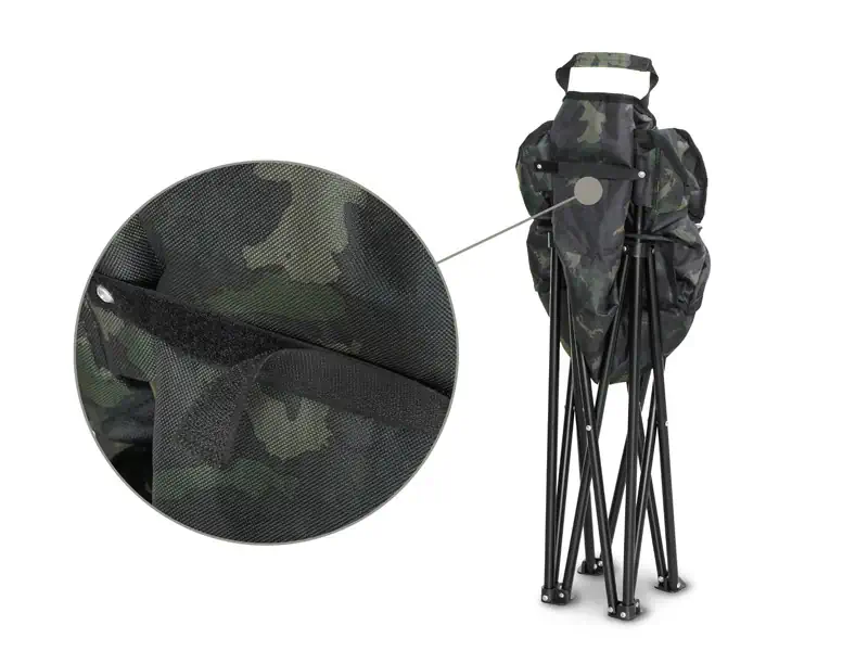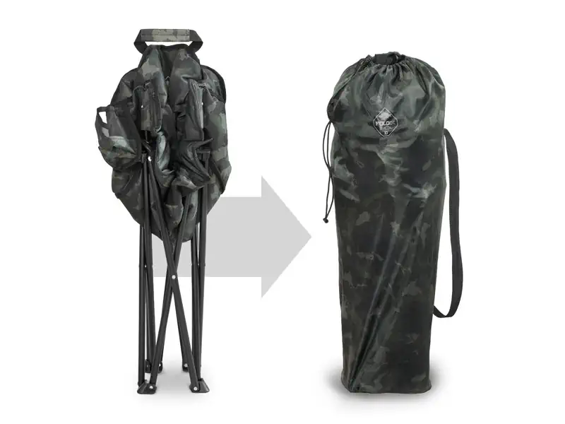 Tuolissa on käytännöllinen tasku lempijuomalle, puhelimelle tai pienille tarvikkeille. Helpompaa käsittelyä varten FOLDIXissa on mukava kantokahva sekä tarranauhakiinnitteiset hihnat, jotka pitävät tuolin paikallaan kuljetuksen aikana.